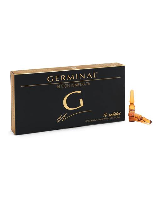 Germinal Acción Inmediata: 1. Efecto lifting inmediato - Mágico - Ocasiones especiales. 2. Mujeres 35-60 años. - Germinal 3.0. Formato: 10 ampollas de 1.5 ml. Ampolla Acción Inmediata: La dosis contiene 1,5 ml. Fórmula: 1º. Proteínas de maiz: efecto tensor. 2º. Factor Hidratante Natural: efecto hidratante. 3º. Extracto de Levadura: activador del metabolismo celular estimulan los fibroblastos: produce colágeno y elastina. 4º. Hamamelis: rico en aceites esenciales. 5º. Extracto de Ginseng: efecto nutritivo. 6º. Alantoina: cicatrizante y suavizante. 7º. Propinlenglicol: efecto hidratante.